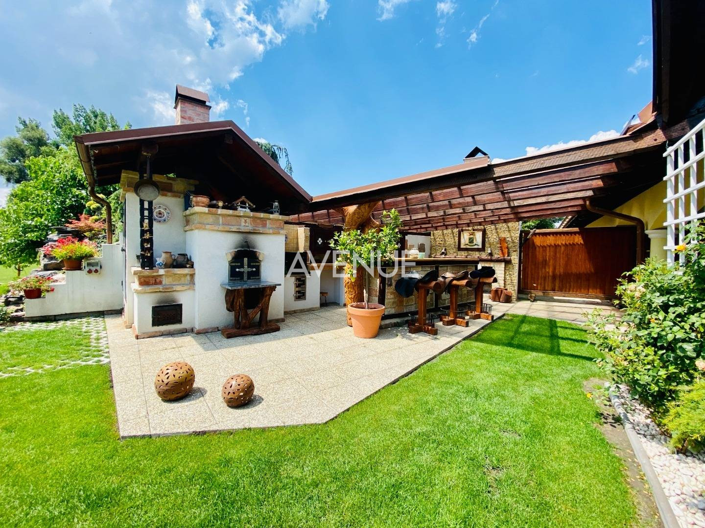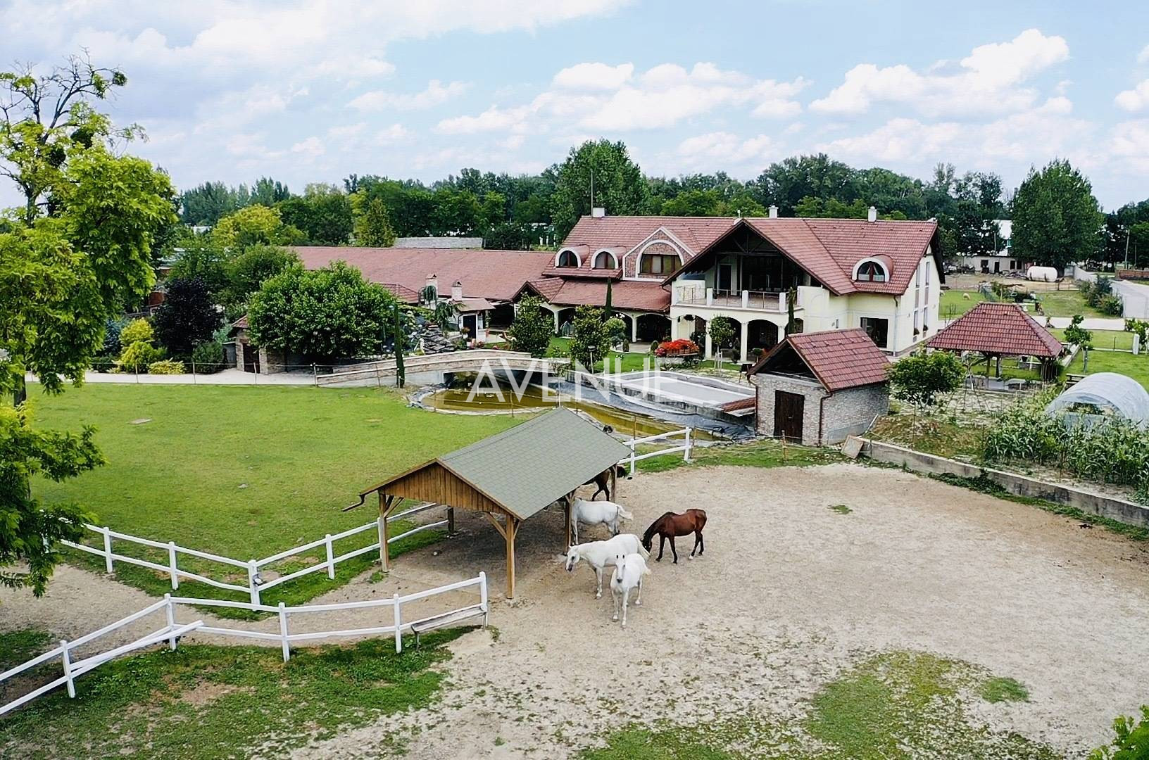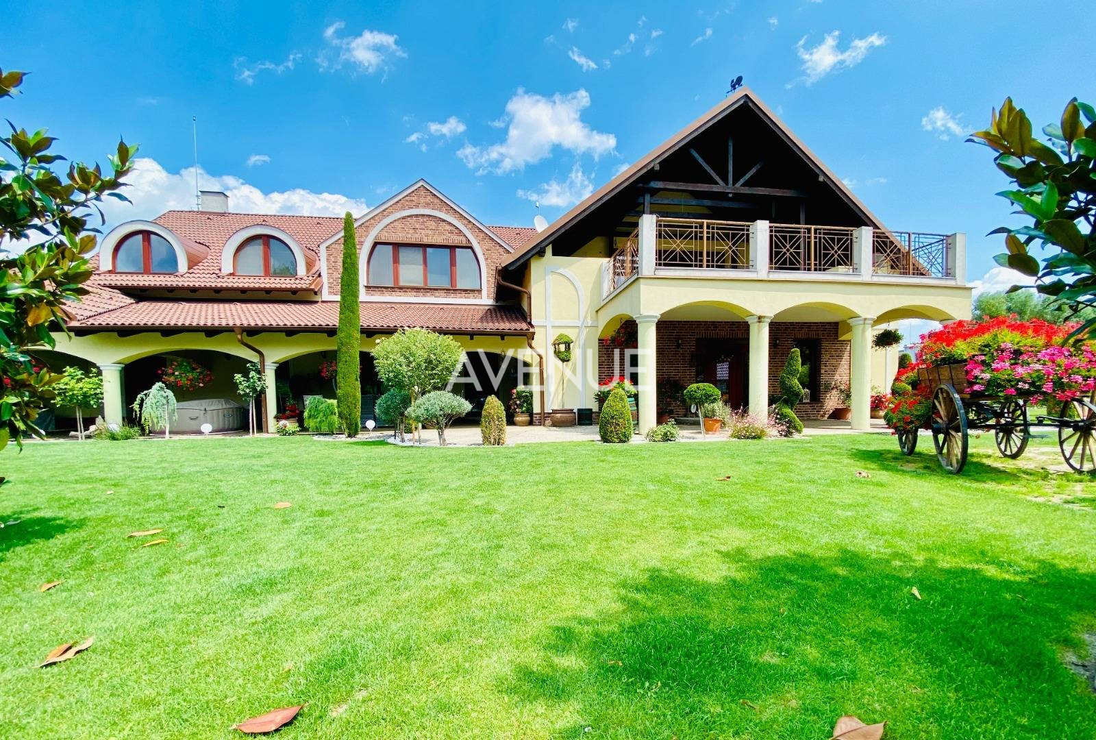 [b]Na predaj, butiková rodinná usadlosť so zvieratami[/b] lokalizovaná v zeleni v obci Dunajský Klátov, okres Dunajská Streda. [b]Príjemná a pohodlná usadlosť pozostávajúca z hlavnej budovy, samostatnými hospodárskymi budovami a krytou tenisovou halou so zázemím s úžitkovou, grandióznou plochou LEN hlavnej budovy cez 1000 m2 z toho obytnou komfortnou plochou 600 m2, je situovaná na pozemkoch o spoločnej výmere bezmála 3 ha.[/b] Svojim pôdorysným tvarom ponúka súkromie a relax ohraničujúca, [b]domčekom so studňou na výdatný prameň pitnej vody, ovocnými sadmi, výbehom pre kone a s jazierkom s prístupom na riečku Klatovský kanál.[/b] Vila s pohľadovými [b]prvkami z dreveného masívu a kameňa[/b] ponúka intuitívne riešenia pre praktický život. [b]Či už letnú kuchyňu s terasou a posedením, biologicky bazén s prepojením na vodopád s cirkuláciou vody alebo unikátne chladnú a tematickú vinnú pivnicu.[/b] Na prízemí domu sa nachádza vstupná hala do obytnej časti domu s príručnou toaletou. [b]Priestranná obývacia izba s masívnym krbom[/b] a oddychovým priestorom plynule prechádzajúce,[b] okolo poctivých keramických kachieľ[/b], do jedálenskej či kuchynskej časti spoločne uzatvárajú dennú časť domu. [b]Na prízemí je ešte nápadite situovaná obchodno-technická časť domu s vlastným vchodom a skladovou halou.[/b] Poschodie je poňaté ako[b] nočná časť s tromi spálňami s kúpeľňami, fitnes zónou, technickou miestnosťou.[/b] Hlavná spálňa s výmerou 25m2 je s vlastnou kúpeľňou a šatníkom. Ostatné dve spálne disponujú jednou kúpeľňou a šatníkom. [b]Veľkolepá terasa na poschodí s rozlohou viac ako 30m2 s priestorom na vírivku ponúka pokoj a príjemný výhľad do zelene, na jazierko či kone a s nerušeným spevom vtákov. [/b]Technologické zabezpečenie je na úrovni, bezpečnostný systém, domový video telefón a plynovo-peletkový kotol na vykurovanie. Parkovanie je možné zabezpečiť v priestrannej hale - garáži pre viac aut, zabezpečujúca prechod suchou nohou do domu. [b]Sympatická dunajská lokalita ponúkajúca život na vlastnej farme s chovom vodného vtáctva, oviec či koní.. a spájajúca, pokojný rodinný život[/b], a ruch veľkomesta ponúka pohodlné [b]bývanie i pre najnáročnejších klientov[/b]. Oceníte množstvo príležitostí, na zdravú prechádzku, športové vyžitie, ako aj blízku riečku Klatovské rameno či Malý Dunaj vhodný na relax [b]a pritom rýchly prístup na diaľnicu.[/b] TOPPONUKA