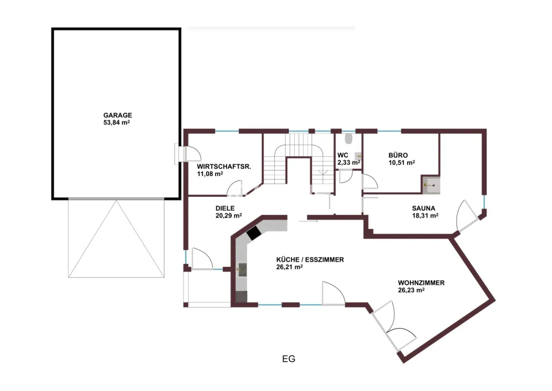 Denná časť na prízemí je riešená ako otvorený a vzdušný priestor s prirodzeným prepojením obývacej izby, jedálne a kuchyne. Charakter interiéru podčiarkujú vysoké stropy, veľkoformátové okná, množstvo prirodzeného svetla a masívne drevené podlahy. Na prízemí sa zároveň nachádza privátne wellness so saunou GRUBER, sprchou a relaxačnou zónou s priamym vstupom k bazénu a do záhrady, ako aj hosťovská izba alebo pracovňa, samostatná toaleta a dvojgaráž.
